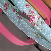 beschichtete Leinen, Wachstuch, mit Reissverschluss, doppeltem Aussenfach und doppeltem Innentäschchen.